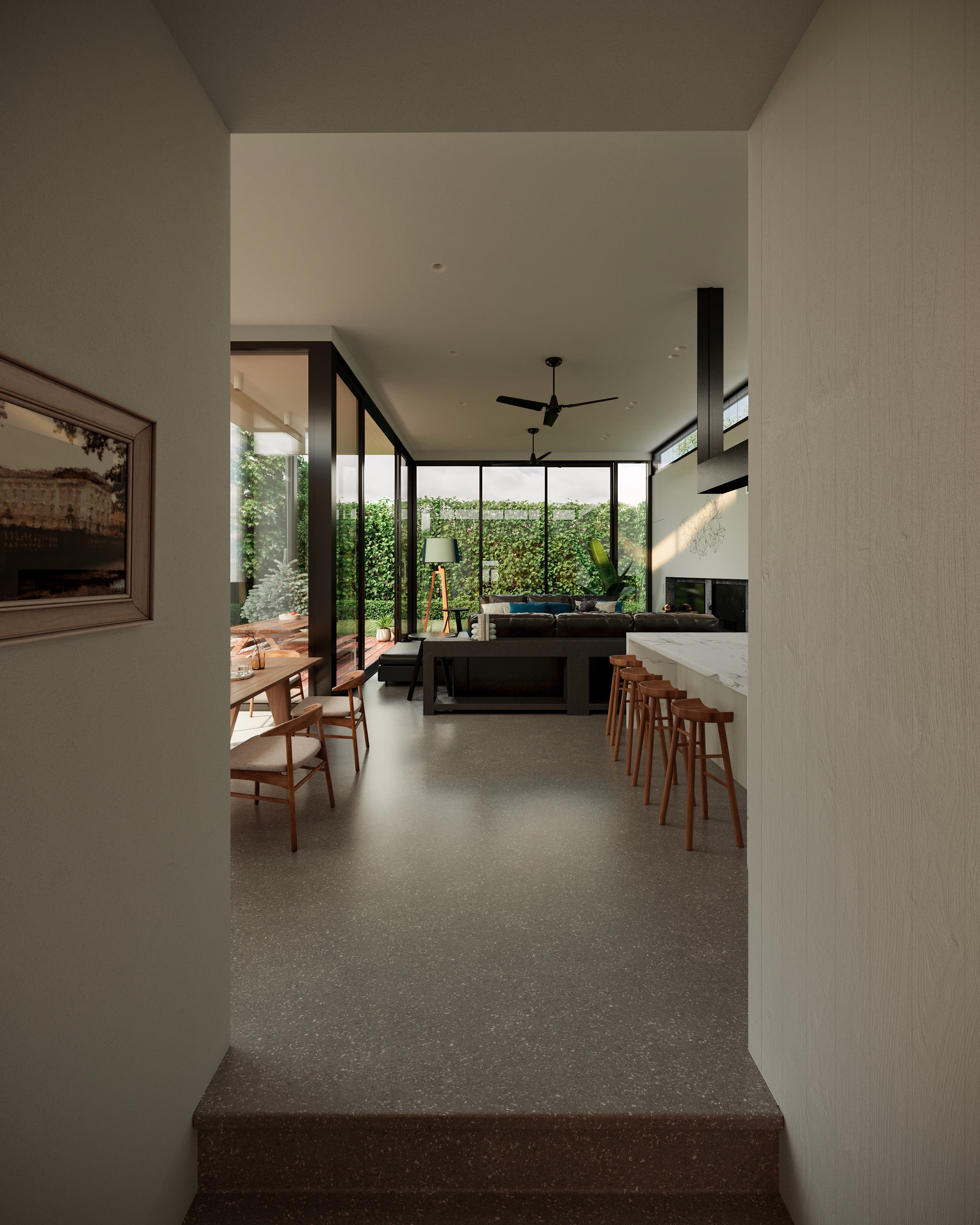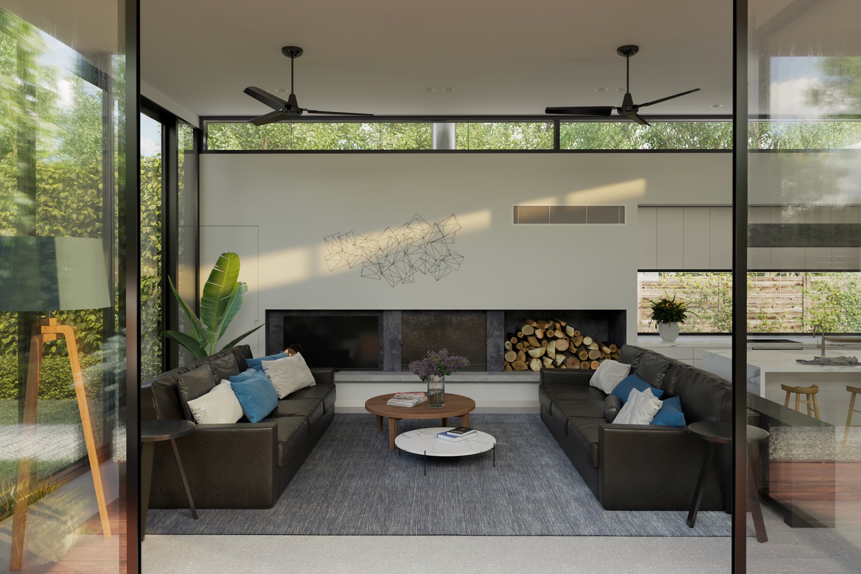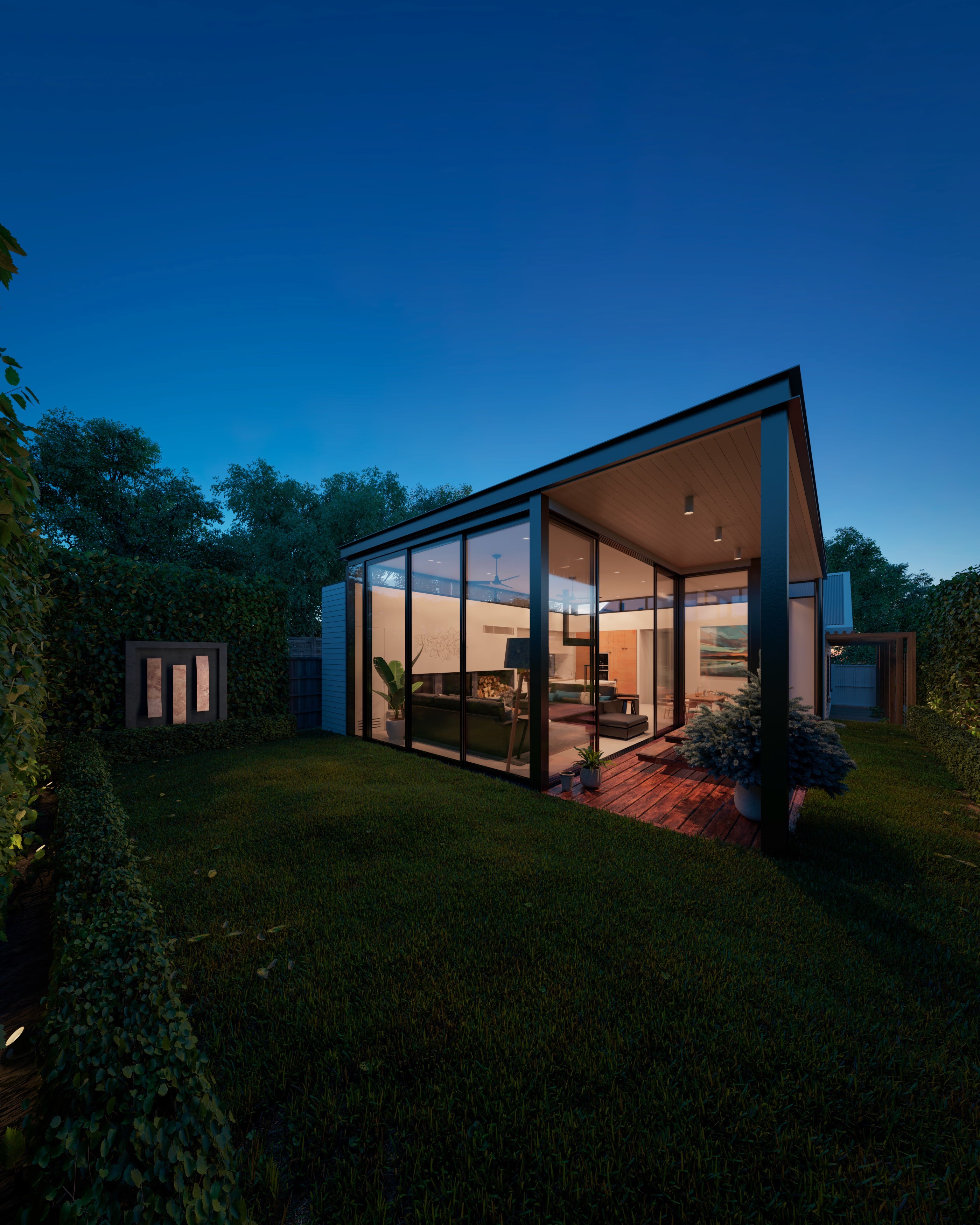 This project explores the dialogue between classical and contemporary architecture within a single residential concept. The front facade reflects a traditional American aesthetic, while the rear volume introduces a clean, glass-driven modern language. We developed the architectural and environmental 3D geometry from scratch, creating a detailed digital representation of the building and its surrounding context. Landscaping and greenery were carefully crafted to reflect realistic suburban conditions and spatial depth. Warm, soft lighting was used to establish a calm suburban evening atmosphere, enhancing the contrast between traditional and modern architectural elements.