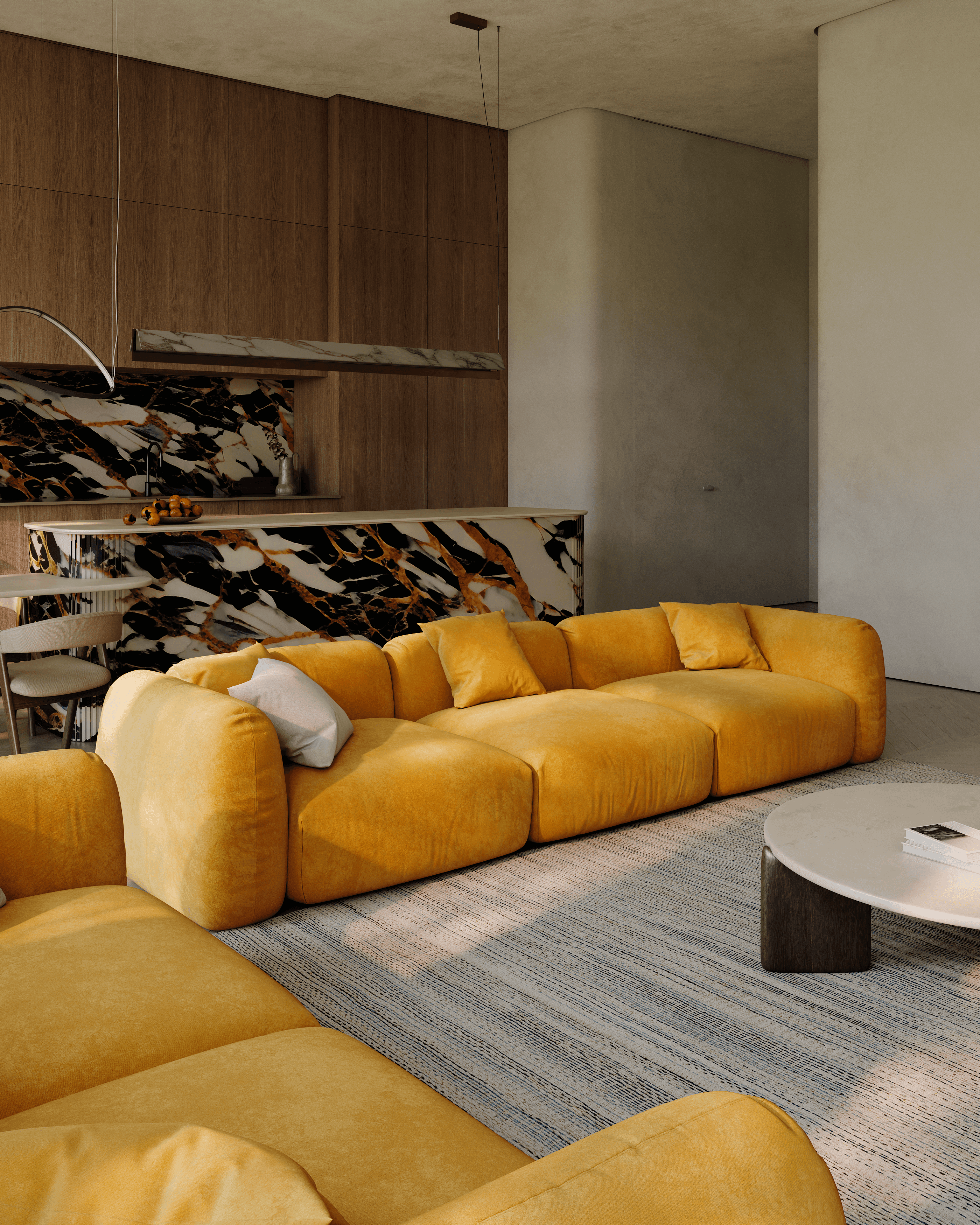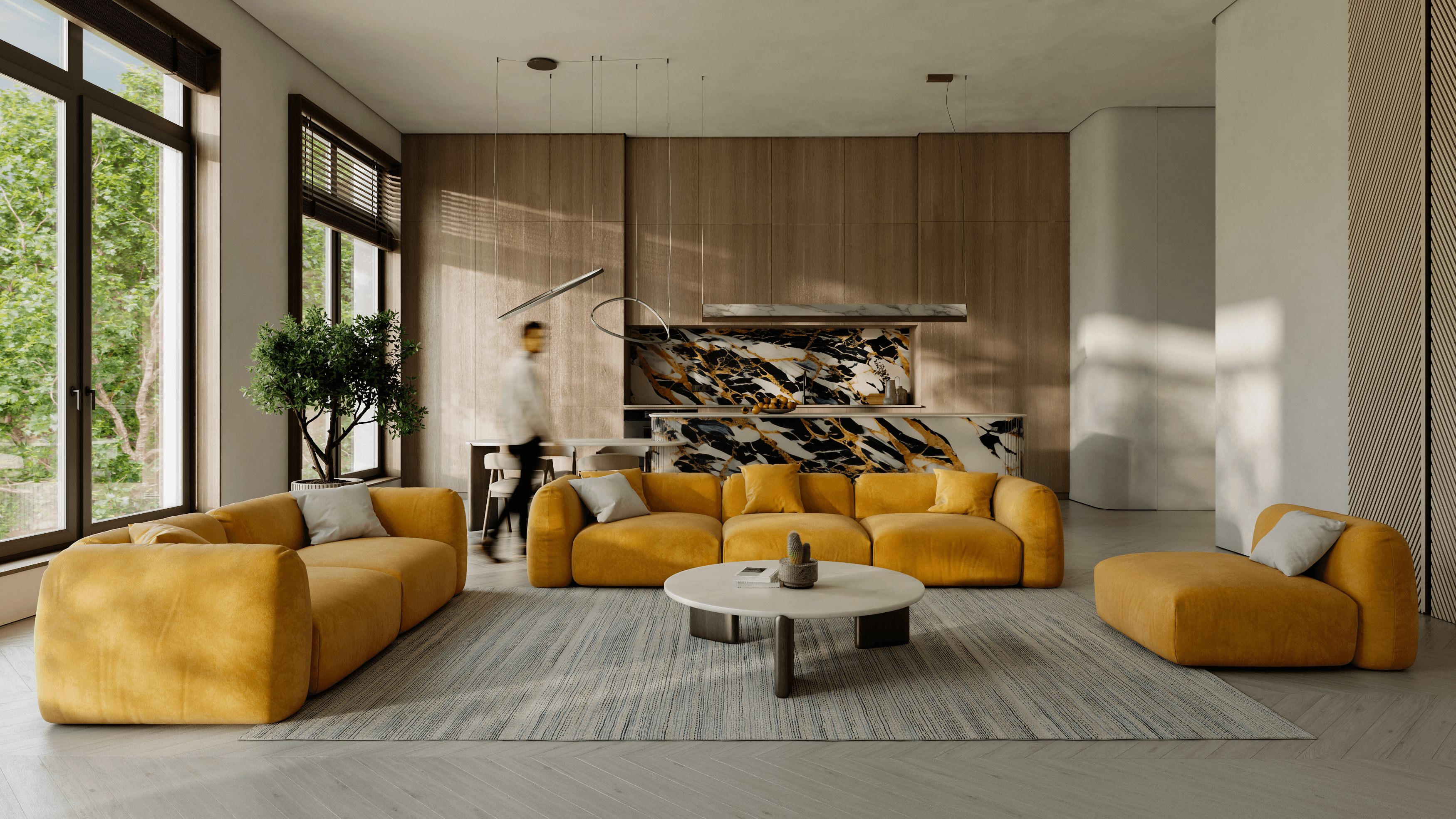 We collaborated with a leading designer furniture brand to develop a 3D presentation of a new sofa model within a light, minimalist interior setting. The project followed a clean minimalist concept built around a soft neutral palette, where the saturated yellow upholstery acts as a bold yet balanced focal point. The contrast between restrained architecture and the vivid accent creates a memorable, visually striking presentation of the sofa within a contemporary residential context.