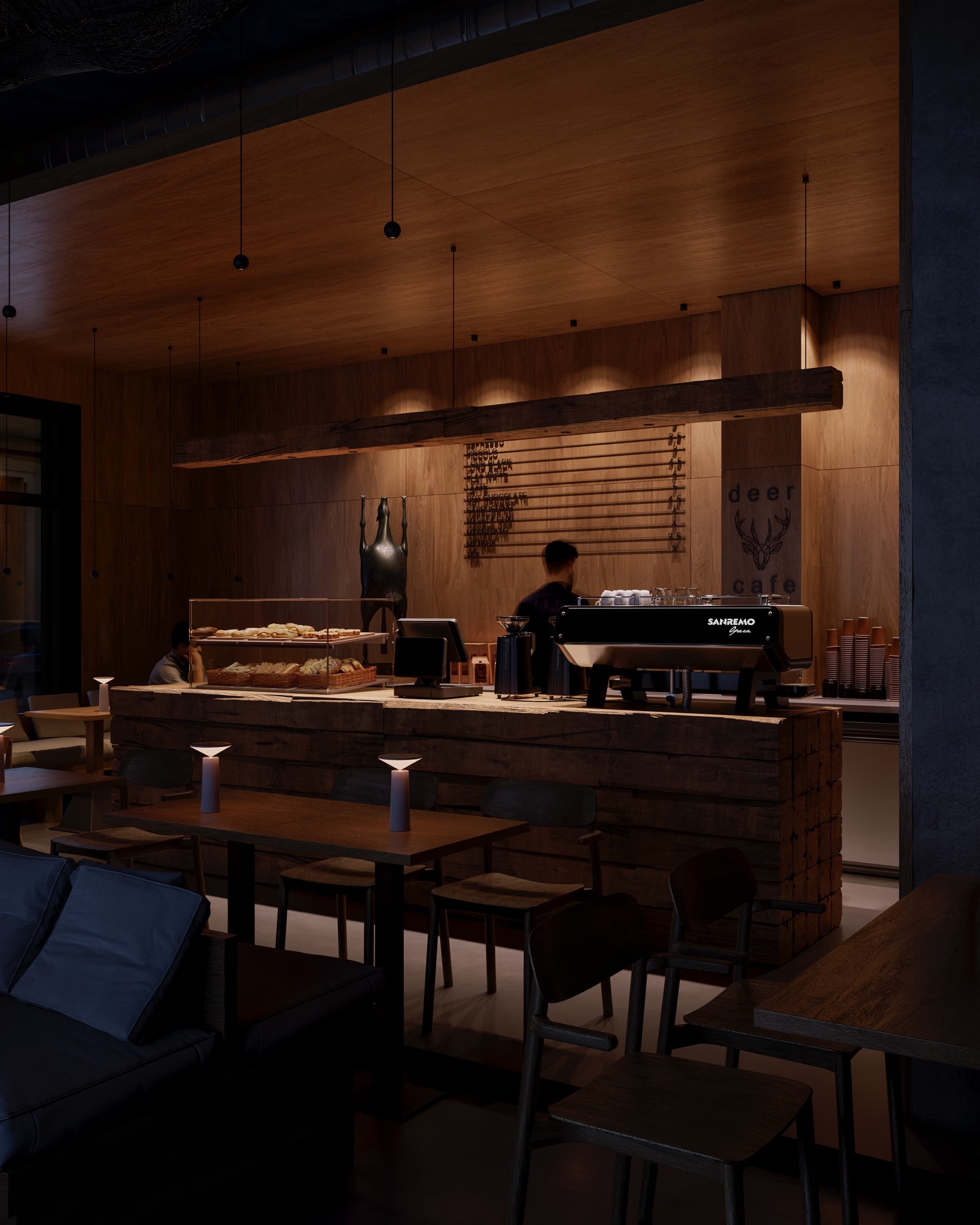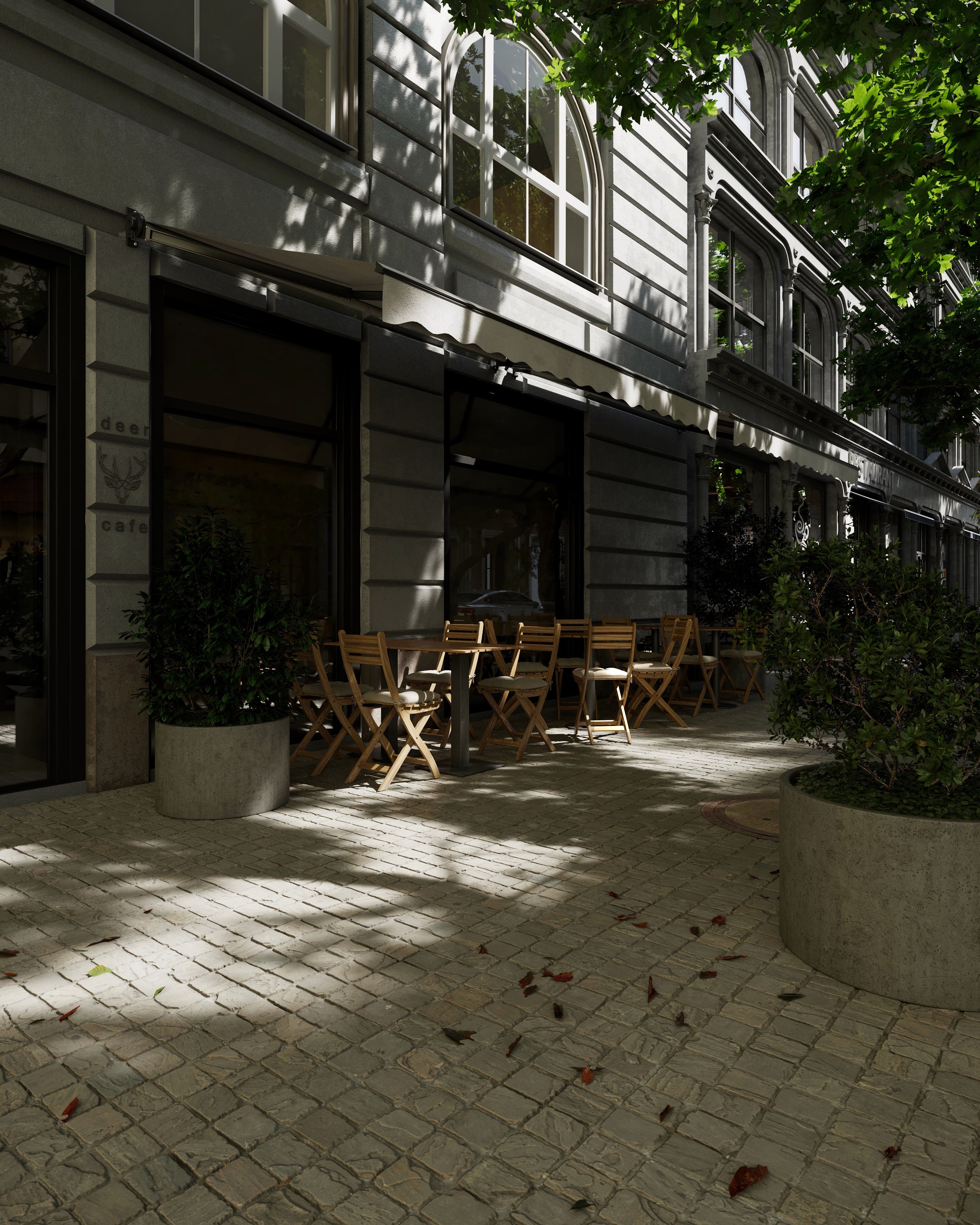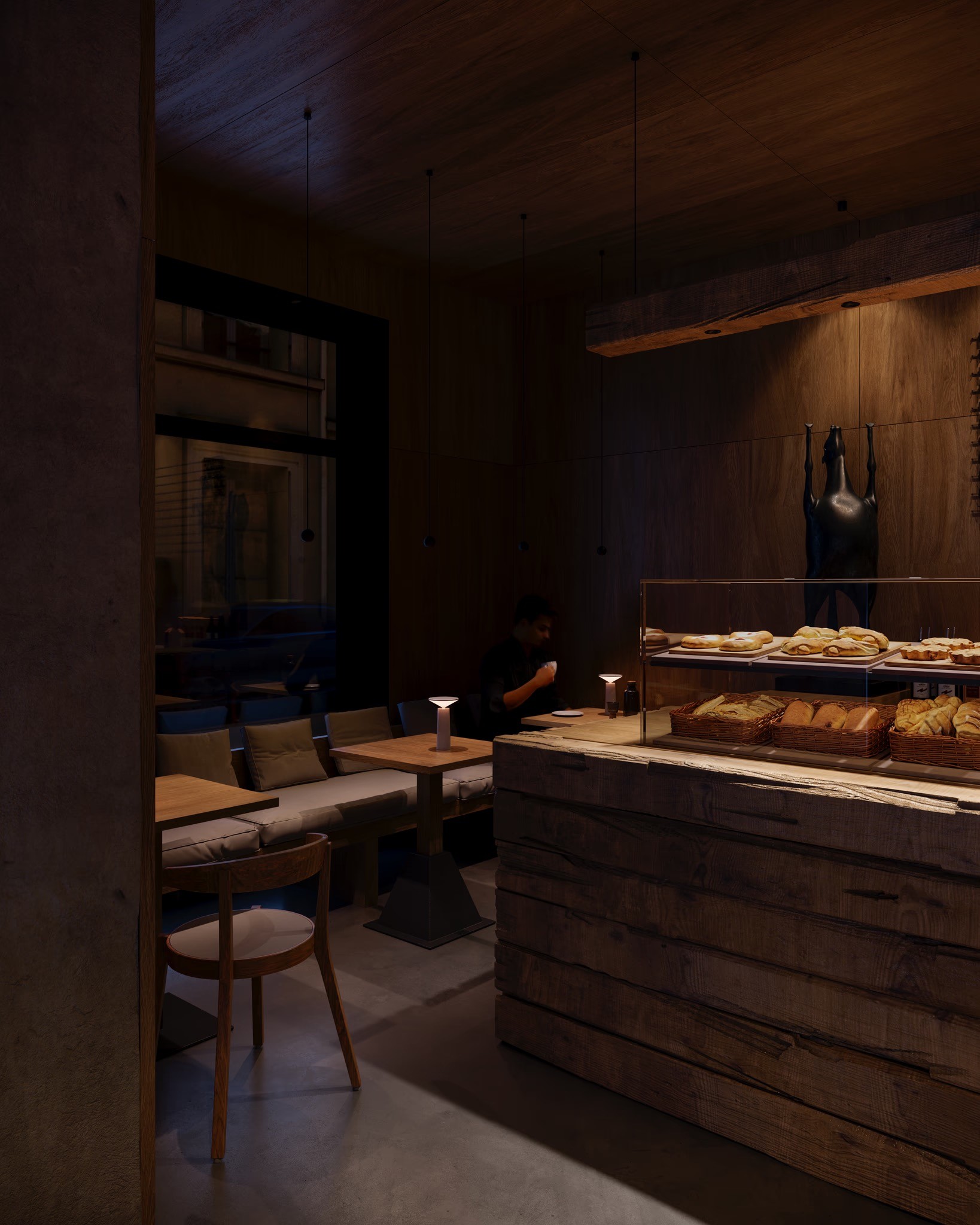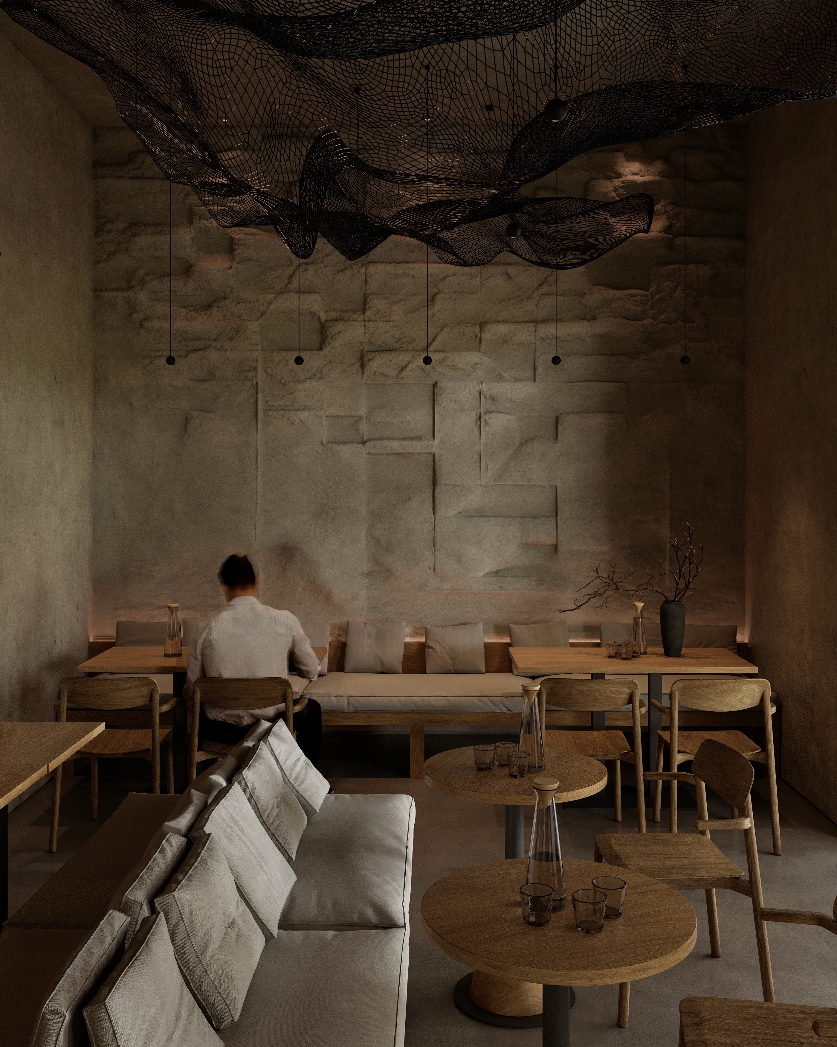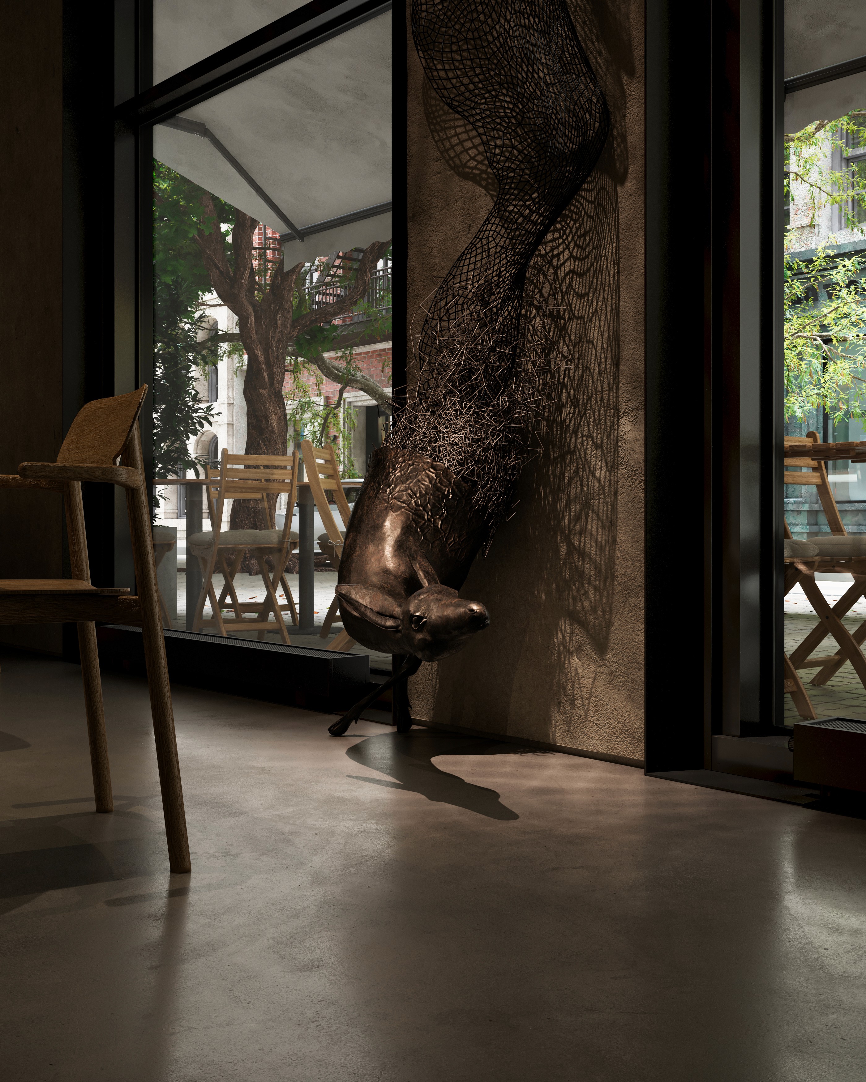 The Deer Café is a hospitality interior where minimalism meets wabi-sabi sensibility, creating a calm, tactile, and identity-driven environment. Textured walls, natural wood, and a sculptural bronze deer define the space’s narrative and visual character. We developed cinematic, market-ready visuals to communicate the design intent, focusing on material expression, spatial depth, and atmosphere. Collaboration with the designer ensured alignment between concept and visual representation.
